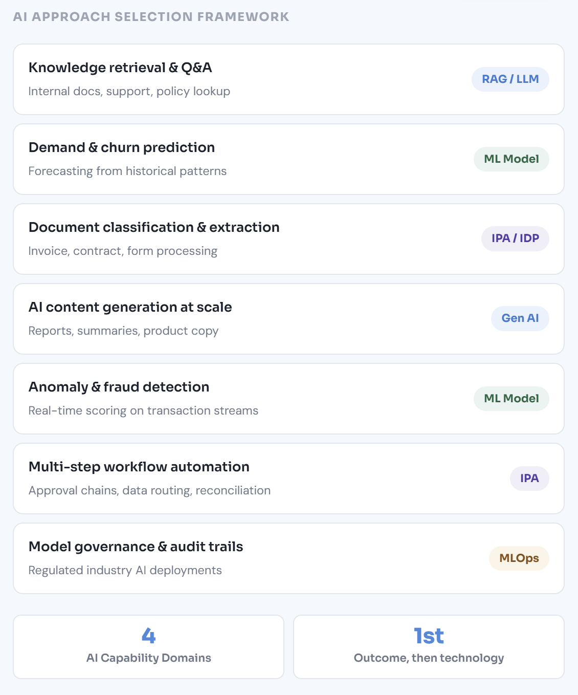 Technology-led AI programmes choose a model and then search for problems it can solve. Outcome-led programmes start with a business problem — a measurable inefficiency, a decision that takes too long, a prediction that would change behaviour — and then work backwards to the simplest AI approach that addresses it. The simplest approach is usually the correct one: a well-designed ML model often outperforms a complex LLM pipeline on structured prediction tasks, at a fraction of the cost and with far better auditability. We run a technology-agnostic opportunity assessment before recommending any AI approach, because the recommendation should be justified by the problem, not by what is currently fashionable.