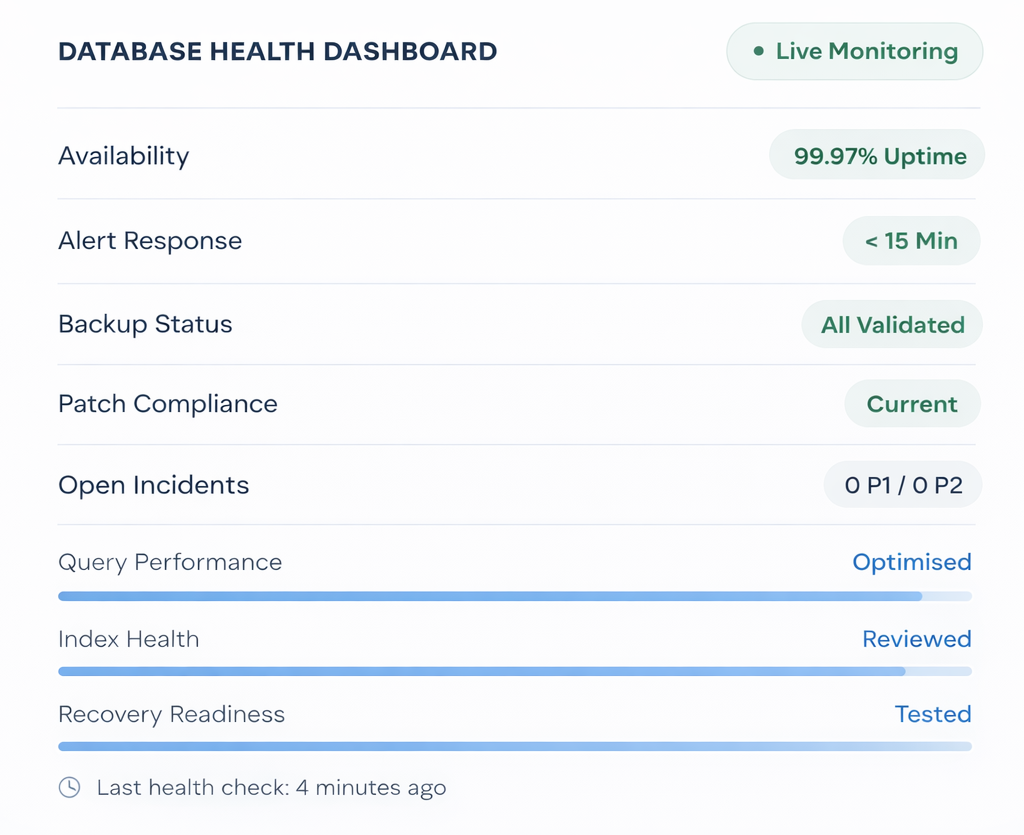 For qualifying engagements, we provide a documented assessment of your database health, risks, and recommended managed service scope.