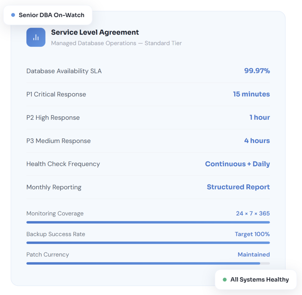 P1 incidents trigger immediate escalation to the senior DBA responsible for your environment — with a 15-minute response commitment and direct engagement until resolution. You receive real-time status updates throughout the incident, and a formal RCA report within 48 hours of resolution. Named contact details for on-call escalation are provided from day one of the service.