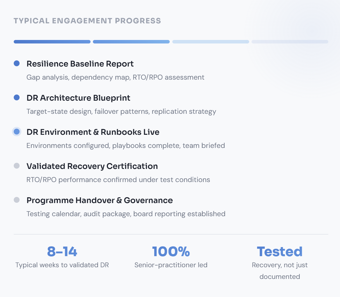 A structured two to three week assessment — baseline resilience report, RTO/RPO gap analysis, dependency map, and prioritised remediation roadmap.