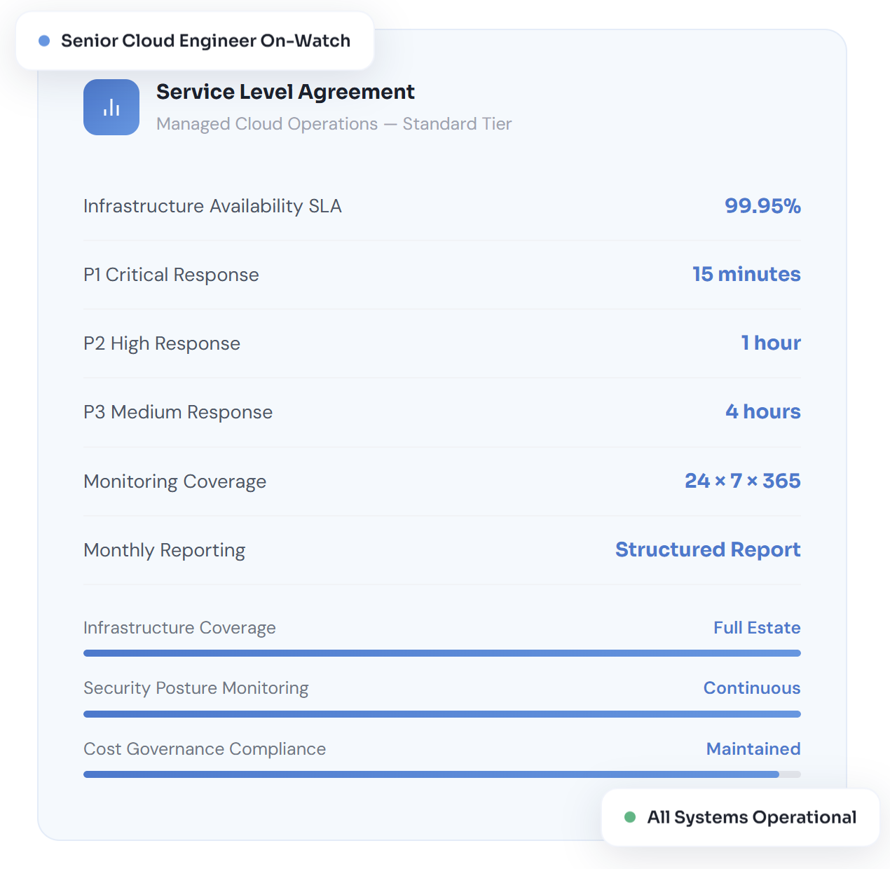 Yes. Multi-cloud and hybrid environments are a core part of our managed service model. We unify monitoring, governance, cost allocation, and incident management across AWS, Azure, GCP, Oracle Cloud, and on-premise infrastructure under a single operational framework — so you receive consistent visibility and accountability regardless of where workloads run.