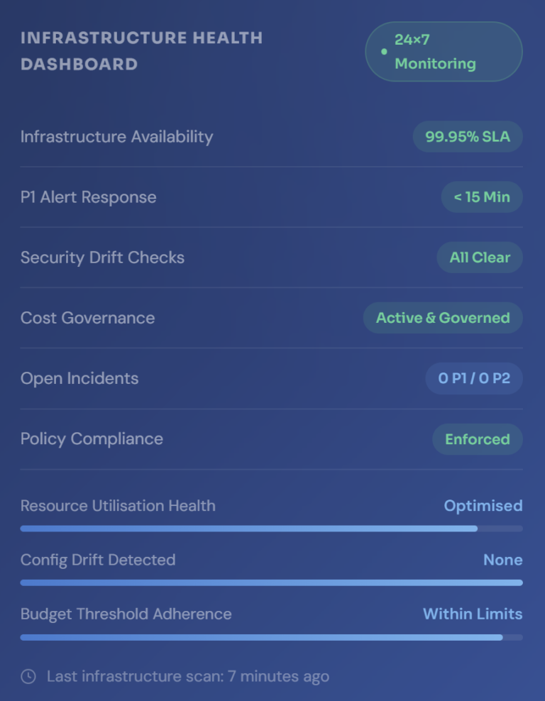 The monthly report covers infrastructure availability and SLA performance, incident summary and resolution status, security posture and drift findings, cost trends and optimisation actions taken, capacity utilisation and forecasts, patch and update status, and recommended actions for the coming period. It is designed to give both engineering and finance leadership a complete, accurate picture of cloud operations in a single document.