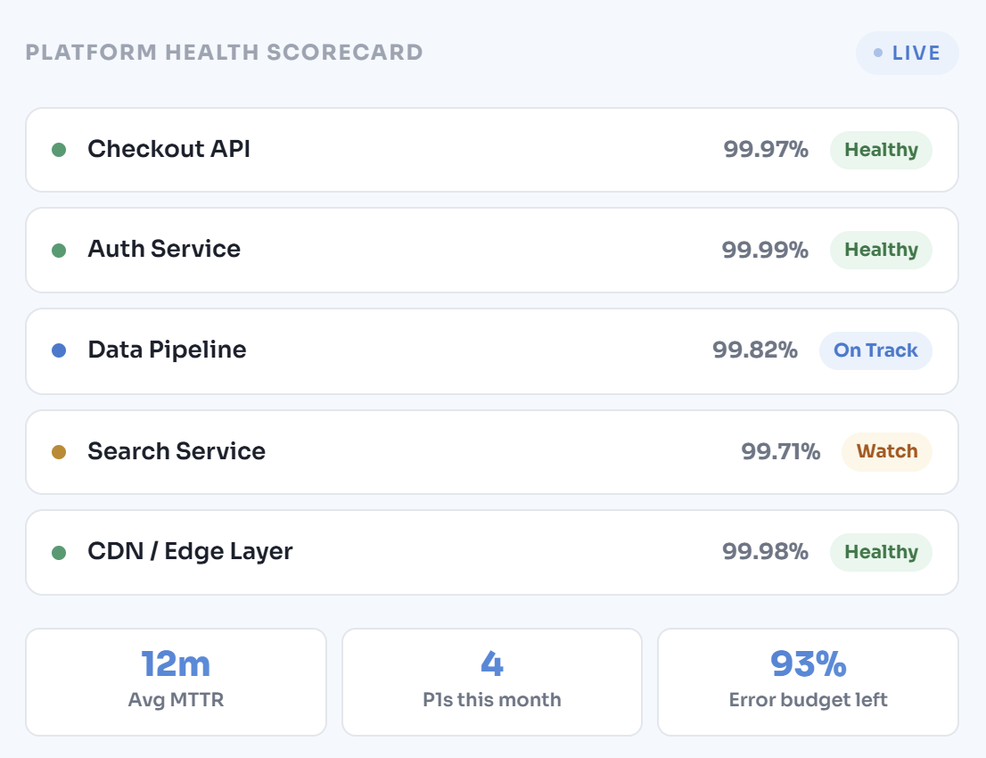 Reliability without governance decays as teams grow and systems change. We design the operating model, review cadence, and accountability structures that keep reliability a first-class engineering concern.