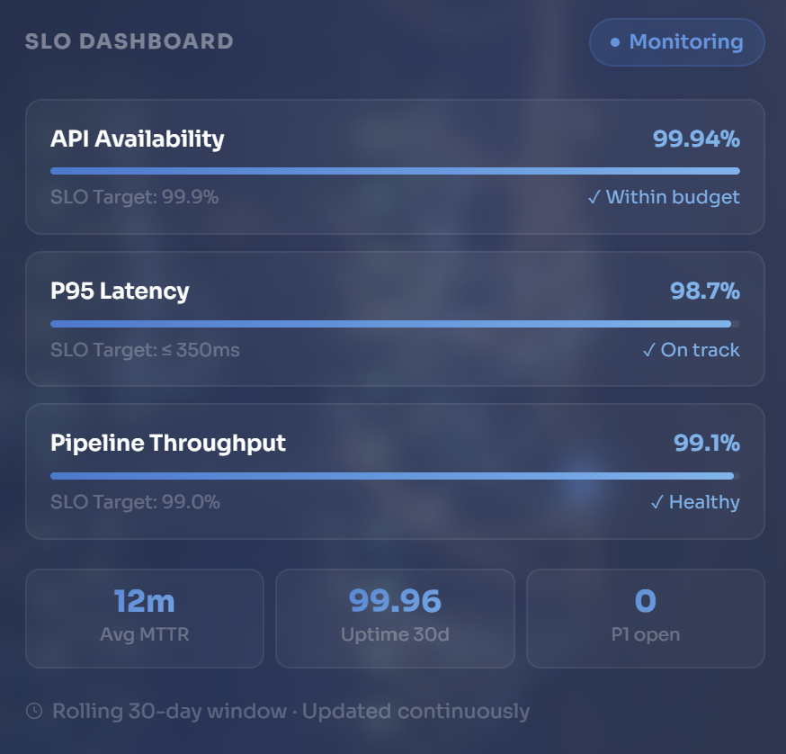 Platform failures are not technology failures — they are architecture and process failures. Systems that lack defined reliability targets, observable failure signals, and structured incident response will degrade under scale, regardless of the cloud provider or the technology stack. We address each discipline as a structured engineering engagement with measurable outputs.